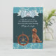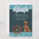 “A little sailor is on his way, let's celebrate with a special day!” This adorable nautical baby shower invitation features a cute brown Goldendoodle, ship wheel, swirling water bubble details, and blue bowtie banner. Perfect for celebrating a baby boy on the way!