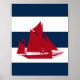 This is a terrific nautical print to go with your decor. It features a sailboat on a navy blue and white striped background.