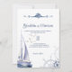 The navy blue design features an elegant watercolor sailing yacht, seagulls and a compass rose for your nautical wedding.