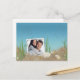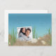 Customised photo frame in ocean bubbles with starfish and seashells in sand for save the date.