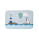 Digital nautical scene with a sailboat sailing in a wavy ocean and a hot air balloon floating passed a stripey lighthouse. Medium bathmat (also available in small and large)