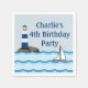 Personalised Children's Birthday cocktail napkins with digital nautical scene of a sailboat sailing in a wavy ocean passed a stripey lighthouse.