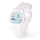 Ladies watch with nautical scene of a sailboat sailing in a wavy ocean passed a lighthouse with a hot air balloon floating in the sky above.