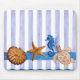 Original watercolor painted design by Sandra Gale, featuring star fish, sea horse, turtle and shells on a background of vertical translucent blue stripes. Great design for the summer, beach homes, bungalows or for anyone who loves the beach, ocean or fish.