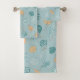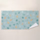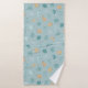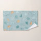 Seashells pattern bath towel set in light teal blue, turquoise, and orange colours is perfect for coastal bathroom decor.