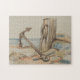 This puzzle design features a depiction of a scene involving a ship anchor lying on the ground near a beach.