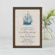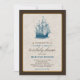 Invite your friends to a nautical themed baby shower with this brown and blue boy's baby shower invitation featuring an old fashioned, vintage ship, a rope border, and anchors.