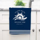 This nautical navy blue and white kitchen towel features a stylised ship’s wheel and ocean waves, with horizontal stripes. The custom text templates “Welcome Aboard” with boat name and registry make it easy to quickly customise the towel for a unique gift or coastal décor. Check out the collection for matching products. If you would like other colorways or more matching products, please contact me through Zazzle Chat.