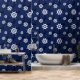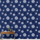 Stylish navy blue and white nautical ship's wheel wallpaper. Big white ship's wheels patterned over a background of circles, in deep blue colours.