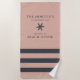 Nautical beach towel features a coastal style starfish and stripes design. Personalise the custom text with a family last name and beach house (or other title) with the year established and location. Hale navy blue and smoky salmon colour scheme.
