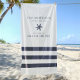 Nautical beach towel features a coastal style starfish and stripes design. Personalise the custom text with a family last name and beach house (or other title) with the year established and location. Hale navy blue and sea salt colour scheme.