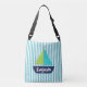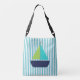 Allover print tote bag with a bright and fun nautical stripe design of blue and white with sailboats on front and back of blue, aqua, and green with an area you can add a name to personalise it!