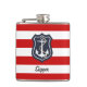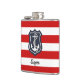 A red and white striped nautical flask for those days at sea, surfside, or dockside. This vibrant design features red and white stripes with a ship's anchor and navy blue shield. Edit the sample name with any name or text. Ahoy!
