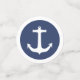 This custom party confetti features a navy blue and white nautical theme. Each piece features an image of a boat anchor. The front side of the two smaller pieces features a white background white a navy blue coloured boat or ship anchor and the back side features a navy blue background with white anchor. The large pieces feature nautical style navy blue and white stripes and anchors.