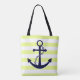 Charming nautical striped beach tote bag in sunny yellow stripe background with a cute navy blue anchor. Cute summer surf shop style totes and cross-body bags for all those long sunshine filled days at the seashore; sunning, relaxing, and of course seashell collecting! Spend a beautiful breezy day at the ocean, or just show your love of the ocean, with custom all over print nautical themed carryall totes - just right for carrying your towel, book, water bottle, frisbee, lotion, or any of your favourite summer essentials! Don't forget to check out the matching flip-flops in our shop link!