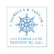 Classy yet modern nautical themed ink stamps. The stamps feature a nautical ship wheel illustration in a vintage style surrounded by the name of the bride and groom and a mailing address underneath.