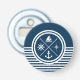 Nautical themed design with nautical symbols (anchor, sailing boat, sailing wheel, compass) decoration on white and navy blue striped background.