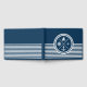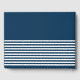 Nautical themed design with nautical symbols (anchor, sailing boat, sailing wheel, compass) decoration on white and navy blue striped background.