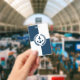 Nautical themed design with anchor and laurel wreath decoration over blue and white geometric background