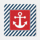 Nautical themed design with anchor decoration in square on blue and white striped background