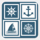 Nautical themed design with sailing wheel, sailing boat,compass and anchor decoration in white and blue striped squares