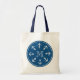 Nautical tote bag with round boat anchor monogram. navy blue and white colours. Elegant typography. Cute maritime design for personal use or wedding party. Anchors aweigh!