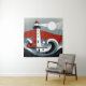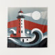 This tapestry presents a modernist vision of a lighthouse, where geometric shapes and bold colours converge to create a minimalist nautical scene. The composition is striking in its simplicity, with a stylised red and white lighthouse standing against the backdrop of a moonlit sea. Abstract waves, rendered in curves and lines, evoke a calm yet rhythmic ocean, suggesting the peaceful passage of time under the watchful gaze of the beacon. The play of light and shadow, along with the restrained colour palette, contributes to a sense of serenity and contemplation. This artwork is perfect for a contemporary setting that values clean lines, abstract beauty, and a modern take on classic maritime themes.