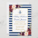 Nautical Wedding Blue Stripes Watercolor Burgundy Marsala Floral Gold Invitation - Blue Back