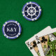 Nautical wedding custom drink token poker chips. Navy blue and white ship wheel wedding poker chips with bride and groom monogram. Customisable initials plus date of amrriages. Personalised party poker chips with monogrammed name initial of newly weds couple. Cute maritime token gift idea for wedding guests. Great for themed venue in Las Vegas or beach destination marriage. Also nice for sailor, boat captain, skipper etc. Use for getting drinks at the bar. Can also be used as keepsake or golf ball markers. Change quantity to get the cheap bulk price. Old boat helm logo on the front. Double sided print. Customisable edge colour.
