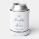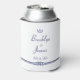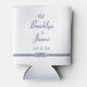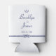Nautical wedding favours - white can coolers with blue anchor and text printed on white background