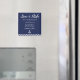 Nautical wedding Save The Date magnets with navy blue and white stripes, white anchor and changeable white text printed on navy blue background