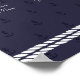 Nautical wedding seating chart with with white anchor and customisable white text - you can add bride's and groom's name, wedding date and guest's names, printed on navy blue background with anchor pattern.