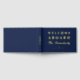 Nautical guestbook for your boat in navy blue with welcome aboard written in gold foil. The o in welcome is replaced with a ship's wheel. Personalize the ship guestbook with the boat name and the year your boat was established with an anchor detail in gold foil. Navy blue and gold ship guestbook with nautical details and custom text. Welcome aboard guestbook for your boat in navy and gold.