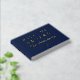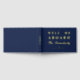 Nautical guestbook for your boat in navy blue with welcome aboard written in gold foil. The o in welcome is replaced with a ship's wheel. Personalise the ship guestbook with the boat name and the year your boat was established with an anchor detail in gold foil. Navy blue and gold ship guestbook with nautical details and custom text. Welcome aboard guestbook for your boat in navy and gold.