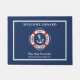 Welcome family and friends aboard your boat or seaside home with this nautical theme “welcome aboard” doormat that features a red and white life preserver accented with sailor’s rope and an anchor on a navy background. Modify the boat name, dock location, and year—plus the four text areas on the life preserver--to create a unique gift for yourself or seafaring friends. Makes a great housewarming gift, too.