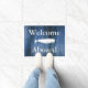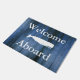 Nautical doormat saying "welcome aboard" in white text featuring blue wooden planks and a nautical whale silhouette in white.