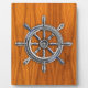 A nautical wheel design on a teak wood veneer grain style background decor. A racy modern nautical gift.