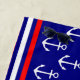 Personalise this navy blue and white anchor beach towel with your own wording.