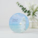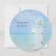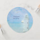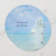 White lighthouse and seagulls with sailboat on watercolor ocean for nautical wedding invitation.