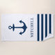 Personalised nautical beach towel features a simple, stylish navy blue and white coastal stripes design with boat anchor. Personalise the custom monogram text with a first or last name.