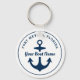 Round nautical keychain design features a simple, stylish white and navy blue coastal style design with boat anchor accent. Personalise the custom text with the name of your boat and her location city and state.