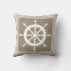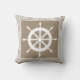 Classic nautical style throw pillow featuring a rustic faux burlap background, white striped frame and a white ship's helm silhouette. Rustic coastal decorating is made easy with this modern yet rustic ship wheel throw pillow.