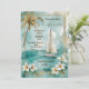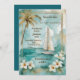 This wedding invitation features a serene nautical theme with a yacht sailing on tranquil turquoise waters. The background showcases a soft watercolor effect in shades of blue and green, creating a calming oceanic ambiance. A graceful palm tree and vibrant white lilies frame the scene, adding tropical charm and elegance. The design is enclosed in a subtle gold-trimmed border, enhancing its sophistication. Perfect for a romantic and adventurous seaside wedding celebration. Personalise the text regarding the names and details of the wedding. You can download the card to your mobile device or computer. I designed the card with ai technology.