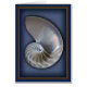 The inside half of a nautilus shell on a blue mat set inside a shadow box frame effect.