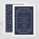 Invite everyone to this memorable and blessed occasion with this lovely invitation in navy blue with a delicate cream floral pattern and a white frame background. The cross can be dragged to any location, made larger or smaller (+-) or eliminated. (<a href='http://www.freepik.com/free-vector/collection-of-decorative-page-dividers_924145.htm'>Designed by Freepik</a>). (<a href='http://www.freepik.com/free-vector/floral-wedding-invitation_1092742.htm'>Designed by Freepik</a>). <br/><br/>The card is easy to customise with your wording, font, font colour, paper shape options and choice of six paper types.<br/><br/>Not exactly what you're looking for? All our products can be custom designed to meet your needs at no extra charge.<br/><br/>Simply contact us at askcottonlamb@gmail.com<br/><br/>Coordinating products available: Just ask us!