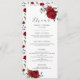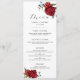 Elegant floral wedding dinner menu card featuring watercolor illustration of navy and burgundy peony flowers with greenery.