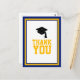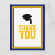 Say Thank You with this Navy and Gold Graduation Party Thank You Postcard. It features 'Thank You' in Gold and a black grad cap surrounded by a navy and gold border. The back is blank for your personal message.