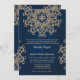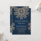 A beautiful navy dark blue sapphire JEWEL TONED and gold wedding invitation with an exotic Indian inspired ornamental sari MEDALLION pattern WITH A FLORAL AND LOTUS SUNBURST DESIGN. This elegant and beautiful modern Indian style wedding invite is perfect for any formal occasion WITH AN EAST ASIAN INDONESIAN MOROCCAN ALADDIN OR ARABIAN NIGHTS THEME. Designed by Chrissy H. Studios, LLC. All Rights Reserved.