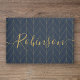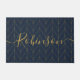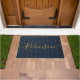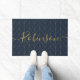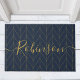 Custom-designed doormat featuring personalized hand calligraphy family name on modern navy and gold art deco leaf pattern.