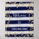Poster print for welcome sign with faux gold glitter design and navy blue stripes watercolor background.